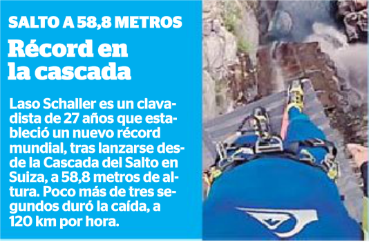 El brasileño pero criado en Suiza Laso Schaller, de 27 años, marca un nuevo record mundial en su clavado desde 58,8 metros de altura en la Cascada del Salto, Maggia, Suiza. La técnica utilizada es una modalidad del barranquismo la cual implica saltar altos acantilados, sin estar sujetado de una cuerda o arnés.